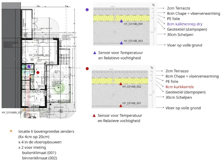 Omdat kurk en schelpen dampopen zijn en de dekvloer niet, volgde Buildwise het vochtgedrag tijdens de werf op met sensoren. Zo werd gecontroleerd of vocht zich correct naar onder kon verplaatsen en niet opgesloten werd onder de dekvloer.